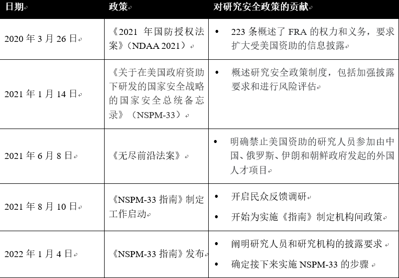 美国的研究安全政策起源于特朗普政府。《2021年国防授权法案》(NDAA 2021)及第223条下达强制指令,对于申请研究人员和研究机构,FRA应要求他们进行数据披露。2021年1月14日,特朗普执政的最后一周的周五,白宫颁布了NSPM-33,意图“加强对那些受美国政府资助的研发的保护,使其不受外国政府的干涉和剥削”,同时“保持开放的环境,以对有益于美国和世界的研究发现和创新起到促进作用”。然而,特朗普政府并没有为研究安全政策的实施提供明确的方向,这使得联邦研究机构和科学界一直处于一种不确定的状态。