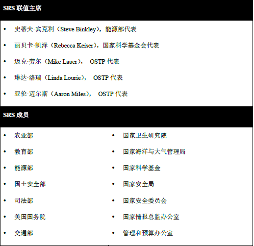 《指南》是在OSTP主任兰德指导下完成的,但实际上,制定工作主要通过一个名叫研究安全小组委员会(SRS)的跨部门小组展开(见表2)SRS工作由一名能源部代表、一名国家科学基金会代表,三名OSTP代表共同主持,其他成员由所有涉及研究和国家安全的主要联邦部门和机构委派的代表组成。值得注意的是,SRS成员名单中有来自联邦调查局、国土安全部、司法部等部门。今后,SRS还将负责为《指南》以外的研究安全领域设计并制定政策。