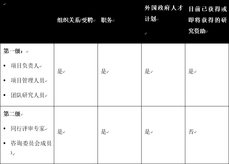 研发过程中的一般性披露需根据NSPM-33的规范分为两级(见表3)。第一级是研究人员,包括项目负责人、项目管理人员和团队研究人员。第二级由申请人所在研究机构的同行评审专家和咨询委员会成员组成。
