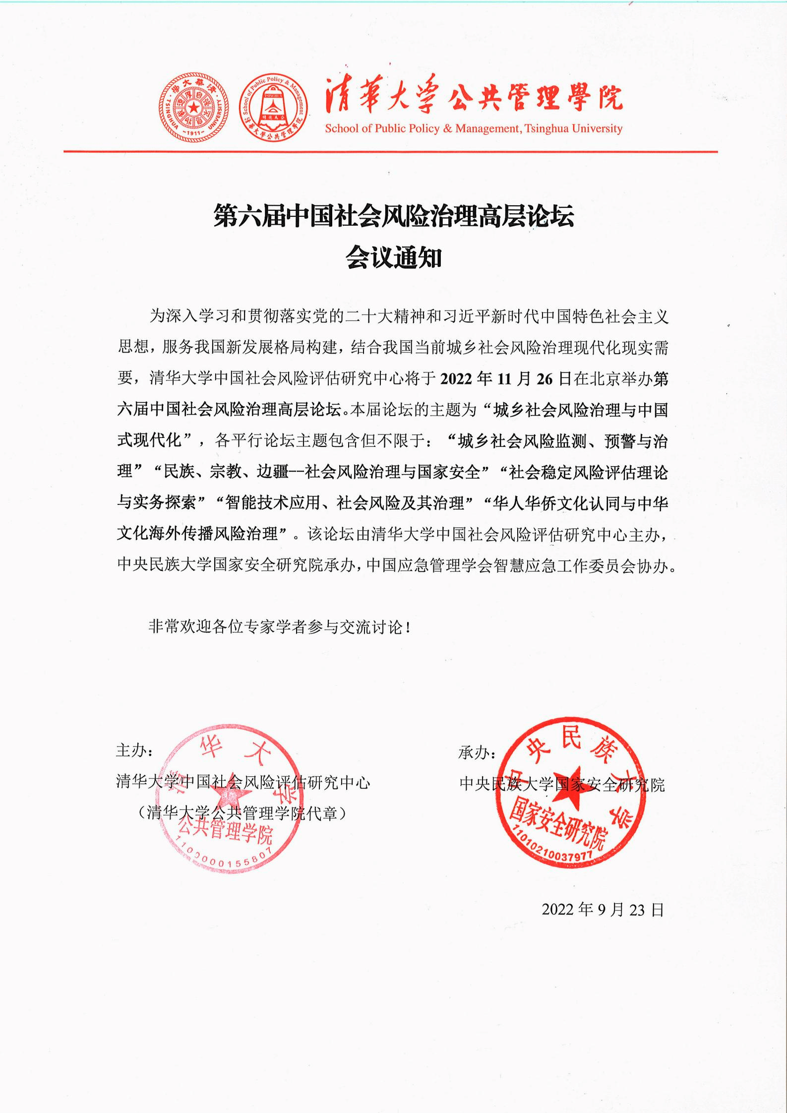 为深入学习和贯彻落实习近平新时代中国特色社会主义思想和党的二十大精神,服务我国新发展格局构建,结合我国当前城乡社会风险治理现代化现实需要,清华大学中国社会风险评估研究中心将于2022年11月26日在北京举办第六届中国社会风险治理高层论坛。本届论坛的主题为“城乡社会风险治理与中国式现代化”,各平行论坛主题包含但不限于:“城乡社会风险监测、预警与治理”“民族、宗教、边疆--社会风险治理与国家安全”“社会稳定风险评估理论与实务探索”“智能技术应用、社会风险及其治理”“华人华侨文化认同与中华文化海外传播风险治理”。该论坛由清华大学中国社会风险评估研究中心主办,太阳城娱乐城
