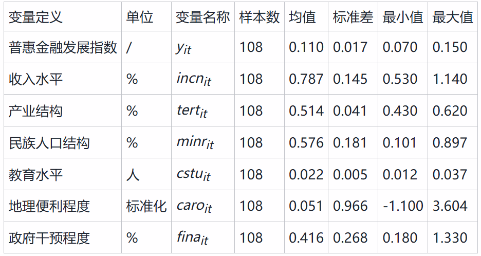 其中,被解释变量yit表示民族地区i在年份t的普惠金融发展指数。核心解释变量包括:居民人均可支配收入与全国水平之比(incnit)、第三产业增加值与GDP之比(tertit)、少数民族人口与总人口之比(minrit)、每十万人口高等太阳城娱乐城