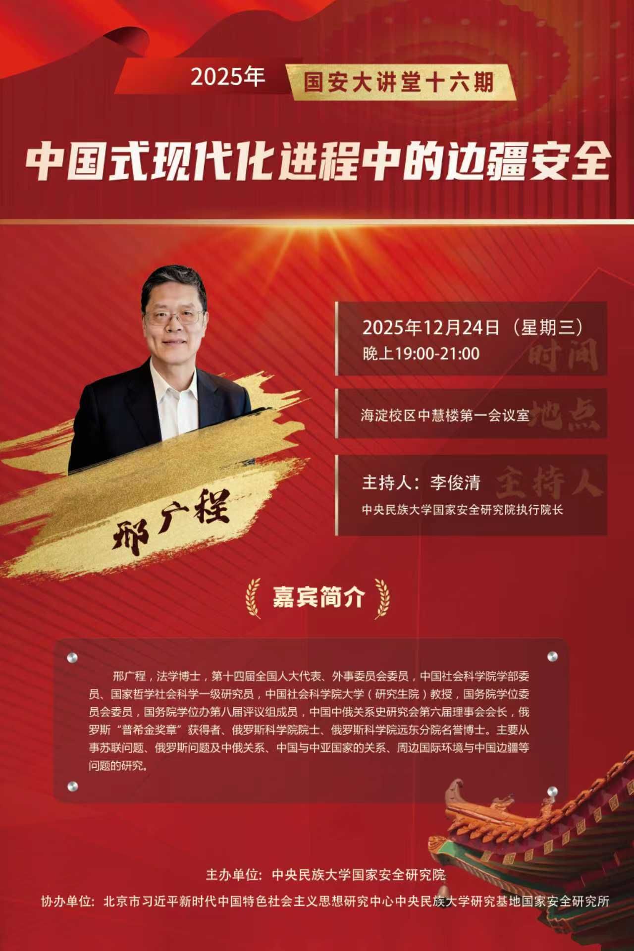 推进边疆治理体系和治理能力现代化,是中国式现代化的应有之义,为切实深化边疆安全与治理领域研究,破解边疆治理理论与实践难题,中央民族大学国家安全研究院将于2025年12月24日举办“国安大讲堂”第十六期,具体安排如下: